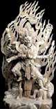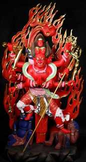 大元帅明王,此明王为明王部之总帅,其本性最为勇勐果敢,其本体传说是大日、释迦,观音,及无尽意,虚空藏等主要的佛与菩萨的合体,其威力绝大无比。其形像种类很多,有一面四臂像,四面八臂像,六面八臂像等,其最勇勐。