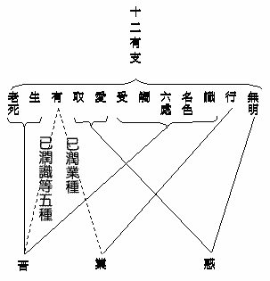 《大乘唯识论》中,于十二有支唯立二世一重因果。十二支中,前十支是因,后二支是果,这前十因支,与后二果支,定不同世。以十二有支是约分段生死的异熟因果来说的,异熟因非造业之身即可受果。既然异熟因果是约有情身生死以为世,故因果支定不同世。以造因时非即受果时故。亦非现业得果可以是十二支故,但十支因中,前十支与爱、取、有三支,可以异世,可以同世。若顺生受的业(即下一生)其世必同;即现世身中由无明发业,熏成
