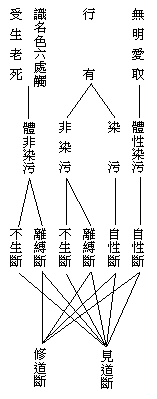 十二、三断门:十二有支,一切皆通见修二道断,不通不断。总起来说,诸恶趣业果及无想定、无想天、半择迦身等有支,皆见道所断。彼等唯是分别烦恼发起,故入见道时一切皆断,有漏善业及无覆无记的若现若种诸有支,皆修道所断。又断有三种:(一)自性断,即诸烦恼及彼相应的诸心心所不善性,和有覆无记染污性法,是自性应断者,见修二道生起现行时,彼即永断。一切有漏不染污的善法,和无覆无记法,非自性应断,体非暗法,不违圣道故。(二)离缚断,即断除能缘有漏善无记法的烦恼缠缚,能缘心不为所缘善无记法缠缚,说名离缚断,即前所说一切有漏善法和无覆无记法是离缚断。(三)不生断,断彼所缘因,令果永不生起,即由因断故,果法不生,是名不生断。如诸恶果异熟趣体,及无想定、无想天等,由圣者见道时,彼等惑业因断故,彼等果法永不得生,故名不生断。此亦包括前说善无记法之一分。在上三种断义中,大概地说,十二有支的无明、爱、取三支染污性故,是自性断,亦即通见修断。虽然亦通离缚断位不生断,以弱故不说。行、有二支,通自性、离缚、不生三断;亦即通见修所断。染污性的自性断,非染污的通不生断和离缚断。若行支中的善业,及有支中的识等五果无记种子,即通离缚断和不生断,不生断即是见道断,离缚断即是修道断。识等七支,唯通离缚断和不生断,体非染污,故不属自性断。即识等五果种及生老死既是无记法,其通不生断的,即是见道所断,如恶趣异热果及女人身等,唯是见道不生断。其通离缚断的,即是修道所断,如人天异熟果,唯是修道离缚断。立表如(表四十七):
